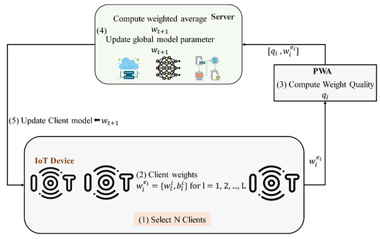where is a hyperparameter that controls the strength of the weighting function. The higher weight quality indicates the local model updates are more accurate and reliable and will be given more weight during global model aggregation. The PWA method then combines the model updates from all devices by weighting them according to their quality measures. The updated global model parameter is given by: