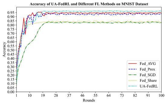 However, the UA-FedRL approach achieved good accuracy when both submodules were combined together, achieving an accuracy of 96.87% and 32.35% on the MNIST and CIFAR-10 datasets, respectively. This outcome validates the dynamic combination between the UA-RL and PWA within the UA-FedRL method.