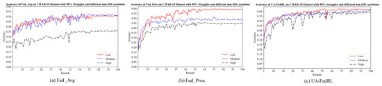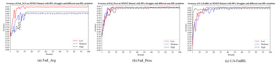 Figure 11 describes the performance metrics of three methodologies tested across 100 clients, 90% of whom were identified as stragglers. These methods were trained for 100 rounds and assessed various non-IID data distributions. Figure 11a provides an assessment of the Fed_Avg methodology under three distinct non-IID conditions: low, medium, and high. The observation suggests that while Fed_Avg showcased proficient accuracy rates, surpassing 90% under low non-IID data conditions, its efficiency notably decreased with higher levels of non-IID data distribution. This pattern underlined Fed_Avg’s limited adaptability to higher heterogeneity in data and training environments.