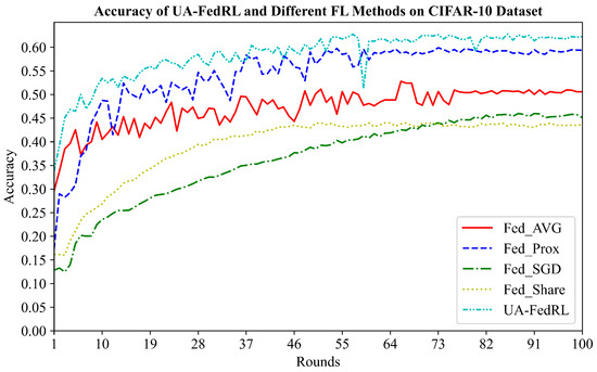 The accuracy comparison between UA-FedRL and different FL methods on the CIFAR-10 dataset.