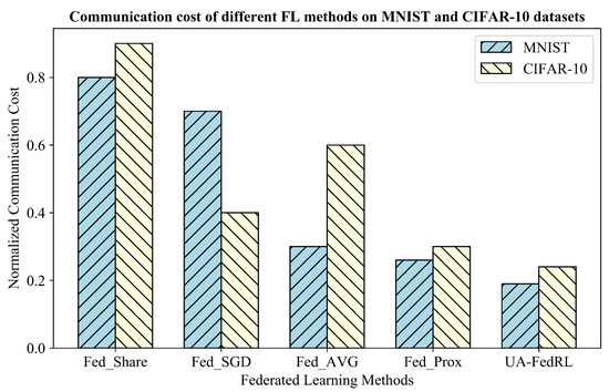 The results represent the variation in efficiency among FL methods to reduce communication costs. UA-FedRL emerged as the most communication-efficient method for both datasets, demonstrating costs of 0.19 and 0.24 for MNIST and CIFAR-10, respectively. On the other hand, Fed_Share exhibited the highest communication costs for both datasets, peaking particularly for CIFAR-10 with a cost of 0.9. Therefore, the chart highlights the critical role of selecting the appropriate FL method for optimizing communication costs in heterogeneous industrial IoT scenarios.