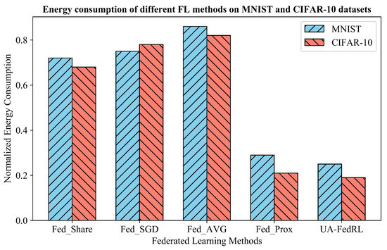The UA-FedRL method emerged as the most energy-efficient model across both datasets, acquiring the least normalized energy consumption values of 0.25 and 0.19 for MNIST and CIFAR-10, respectively. On the contrary, Fed_SGD consumed the most energy for the CIFAR-10 dataset with a value of 0.78, while Fed_AVG showed the highest energy use on the MNIST dataset at 0.86. These results highlight the energy efficiency of different FL methods when deployed on different datasets.