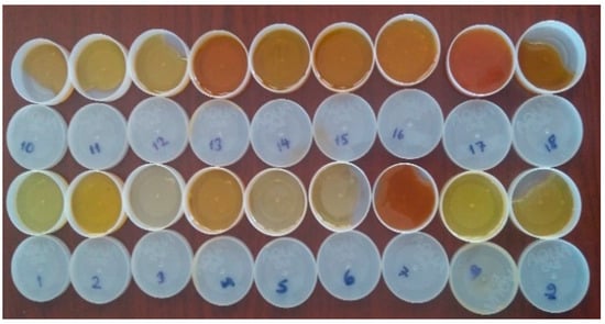 The appearance of the honey samples used for the melissopalynological, physicochemical, and antibacterial determinations.
