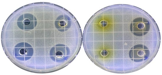 The antibacterial activity of all the honey samples against each of the bacterial organisms was examined using the agar well diffusion method []. For this, a volume of 200 µL of inoculum from each microorganism was mixed in Mueller–Hinton agar plates and solidified. After, four 8 mm diameter wells were opened in each Petri dish, and the analysis was carried out in two parallels. The prepared wells were filled with the honey sample itself and the previously diluted honey solutions. The dishes were incubated for 18–24 h at 37 ± 1 °C for bacterial growth. The zone of inhibition (in millimeters) was measured using a digital caliper.