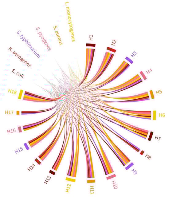 Chord diagram based on the antimicrobial potential (i.e., MIC) of the evaluated honey samples against several microorganisms.