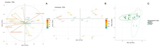 PCA plots of melissopalynological analysis, physicochemical composition, and color characteristics (A) of the collected honey samples from different geographical regions (B), at a confidence level of 0.95 (C).