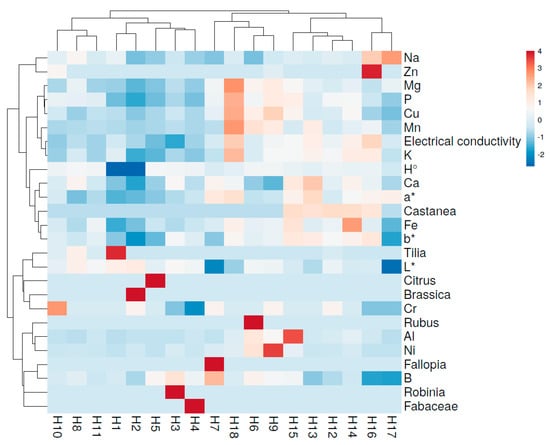 A heatmap summarizing the mineral profile pattern in honey samples according to their color characteristics and botanical origin is visualized in Figure 5. Following the cluster analysis and importance score, the upper main cluster highlights the samples from Bulgaria and Cyprus differentiated from the other honey types mainly due to their botanical origin with a predominance of pollen from Brassica, Citrus, and Robinia genera and Fabaceae and higher luminosity (L*), but also due to their elevated levels of Cr and B. The following cluster underlines the honeydew honey samples (collected from Türkiye and Romania) and Rubus sp. and Fallopia honey types from Romania (i.e., H6 and H7, respectively) which, according to their position in the heatmap, outline the importance of the botanical origin that influences the mineral composition. These honey types presented significant levels of Al, Mg, P, Cu, Mn, and Ni. The outlier sample with predominant Fallopia (H7) is imperative to be mentioned as it accumulated the highest level in B and has the most vivid red hue (a*) compared with all the honey types under study. Subsequently, the honey samples with a predominance of Castanea sp. presented noteworthy accumulations of both Fe and Zn, along with significant levels of Ca and K. Therefore, the botanical origin of honey plays a crucial role in the determination of mineral composition, as evidenced by the significant levels of various elements found in different honey types [,]. As previously highlighted, the outlier sample from Fallopia (H7) stands out for its high levels of B and vibrant red hue, while the honey samples with Castanea sp. as the predominant botanical origin show notable accumulations of Fe, Ca, K, and Zn.