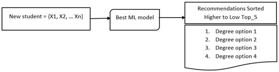 Furthermore, Slim proposed a framework for recommending academic programmes, courses, and instructors using collaborative filtering and non-negative matrix factorisation. While their system focused on optimising course schedules, our approach aimed at predicting standardised test results and recommending degrees, thereby supporting long-term academic planning [].