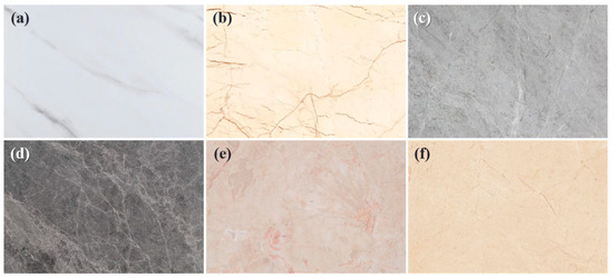 Natural marble tiles used in this study: (a) Volakos (VO), (b) Sofitel King (SK), (c) Castle Gray (CG), (d) Yinding Gray (YG), (e) Focus Cream (FC), and (f) Crema Marfil (CM). The optical images were taken by a camera.
