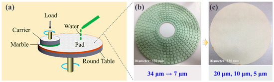 The semi-finished marbles were cut into dimensions of 60 mm × 60 mm × 20 mm. As shown in Figure 4a,b, before the polishing experiments, these semi-finished marble samples were pre-ground for 8 min using 34 μm and 7 μm traditional fixed abrasive grinding pads on a polishing machine, respectively. Then, the pre-ground marbles were polished with 20 μm SG polishing pads to investigate the optimal polishing time. The optimal surface glossiness sample from the previous process was used to investigate the optimal polishing time for 10 μm and 5 μm polishing pads, respectively, as shown in Figure 4c. The grinding or polishing pad and the marble rotated counterclockwise. According to the simulation results of the abrasive particle trajectory, the speed ratio of the pad and the marble tile was set to 2.16, and a constant pressure of 1.5 kg was maintained. In addition, pure water was used for cooling and lubrication during polishing.
