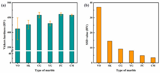 The average hardness values are shown in Figure 5a. The orange error bar in each column represents the standard deviation of the distribution (SDD) of the hardness of all kinds of marbles. The detailed SDD value is given in Figure 5b. Although the average values of surface hardness between different marbles are relatively close, the SDD of the hardness of each marble is very different. The SDD of the hardness indirectly reflects the difference in the hardness of the composition of each kind of marble. The larger the SDD of the hardness, the greater the difference in the hardness of the composition and the worse the hardness consistency of the composition. Among these marbles, the SDD of the hardness of VO marble and CM marble tile is the largest and the smallest, respectively, which indicates that the hardness consistency of VO marble and CM marble are the worst and the best, respectively.
