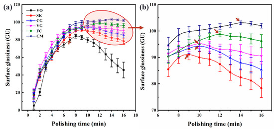 - The ease of polishing order is VO > SK > CG > YG > FC > CM according to the curve of surface glossiness with time.