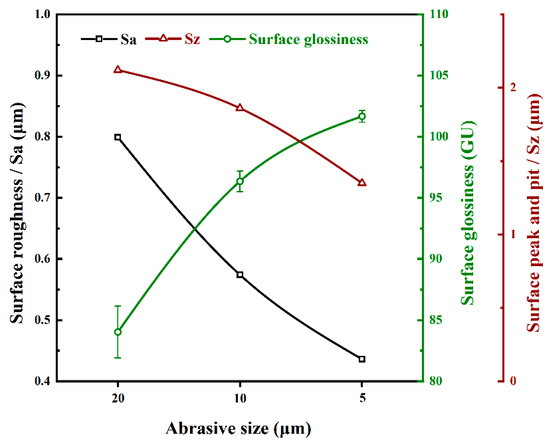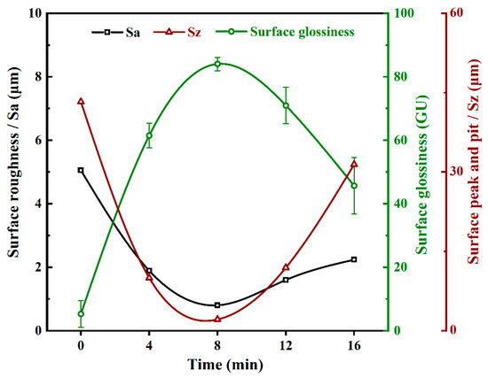 The surface quality of VO marble tile was tracked at 4, 8, 12, and 16 min during the polishing. Figure 7 shows the surface roughness (Sa) and surface peak-to-valley value (Sz) of VO marble tile during the polishing process using an SG polishing pad with a grain size of 20 μm. Before polishing, both the surface Sa and Sz were very large, as shown in Figure 7, while the surface glossiness was very low, and it was almost matte. After being polished for 4 min, the Sa and Sz of VO marble tile decreased rapidly, and the surface glossiness increased rapidly, exceeding 60, while the SDD of the glossiness decreased.
