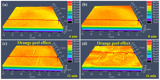 Three-dimensional surface topography of the VO marble tile after polishing for different times with 20 μm diamond abrasive: (a) 4 min polishing, (b) 8 min polishing, (c) 12 min polishing, and (d) 16 min polishing.