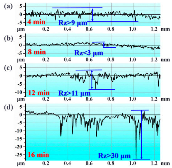 Surface profile at different polishing times: (a) 4 min polishing, (b) 8 min polishing, (c) 12 min polishing, and (d) 16 min polishing.