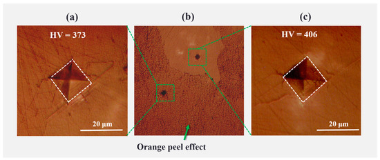 Vickers hardnesses of different zones of the marble tile surface after the orange peel effect appeared during polishing: (a) Vickers hardness of the rough zone, (b) surface with the orange peel effect, and (c) Vickers hardness of the smooth zone. The green arrow pointed in (b) is the zone with orange peel effect, and the green rectangle represents the location where hardness was tested.