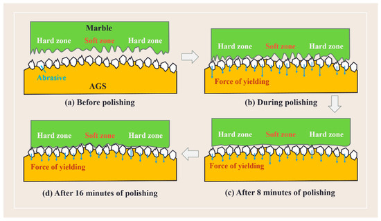 Figure 11 shows the surface evolution mechanism of marble tile during polishing. The exposure height of the abrasive particles on the SG pads is inconsistent during the polishing process because of the rough and uneven marble tile surface. Each abrasive grain appears to have a different degree of yield, which leads to different yield pressures for each abrasive grain [14,21], as shown by the blue arrow in Figure 11. This yield force directly affects the polishing pressure of abrasive grains on the surface of marble. At the beginning of the polishing stage, due to the rough and uneven marble tile surface, a lot of material must be removed. The material removal mainly occurs via brittle fracture. The contact area between the marble tile and the abrasive particles is relatively large, and the contact pressure is relatively small, as shown in Figure 11b. When polishing, to a certain extent, the rough and uneven stone surface is almost removed, and the surface tends to become smooth. The material removal occurs mainly by ductile flow, which spreads over the entire surface to obtain a smooth plane. At this time, the contact area between the marble tile surface and the abrasive particles decreases, resulting in increased contact pressure, as shown in Figure 11c. Since natural marble tile is composed of a variety of materials with uneven degrees of hardness and softness, there are hard zones and soft zones on the stone surface, as shown in Figure 11. As the polishing process continues, this phenomenon of inconsistent yield pressure leads to different degrees of material removal by abrasive particles on the marble tile surface with inconsistent hardness. Abrasive particles pass over the hard zones and cut into the soft zones to expose the rough surface, resulting in incomplete ductile flow, poor surface quality, and quality consistency, as shown in Figure 10 and Figure 11d. This material removal inconsistency directly leads to the orange peel effect on the marble tile surface, and this phenomenon becomes increasingly obvious with increasing polishing time. By analyzing Figure 10 and Figure 11, the results of measuring these zones with different polishing effects show that the hardness values vary greatly in different zones, which explains why the VO marble tile is most likely to show the orange peel effect during polishing.