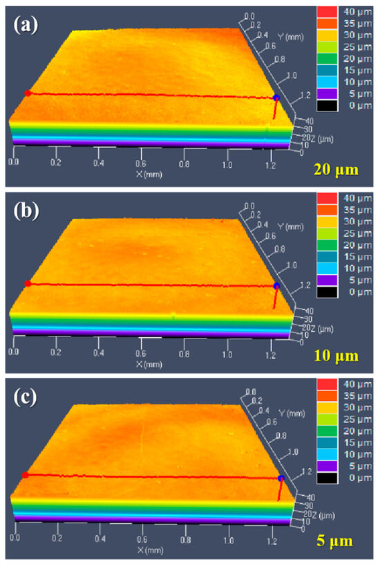 Surface profile after polishing with different abrasive sizes: (a) 20 μm, (b) 10 μm, and (c) 5 μm.