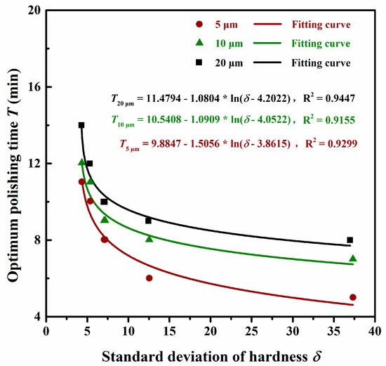 Since the composition of natural marble tile has natural characteristics, different types of marble show different hardness distributions. From a microscopic point of view, the hardness of the material in any different position is different, showing the diversity and randomness of the hardness distribution; however, when viewed from a macro point of view, a certain kind of marble tile has the same mean hardness and SDD of the hardness. The optimal polishing times of the six kinds of marble polished by SG pads with different sizes of diamond abrasives are shown in Table 2 in Section 3.2. The relationship between the optimal polishing time and the SDD of the hardness of each kind of marble is shown in Figure 15. The fitting curve for the optimal polishing time and the SDD of the hardness of the different particle sizes is shown in Figure 15, where R2 is the degree of fit of the curve to the data points. It can be seen that, when different kinds of marble are polished by SG pads with different diamond abrasive sizes, the optimal polishing time has a good logarithmic relationship with the SDD of the hardness.