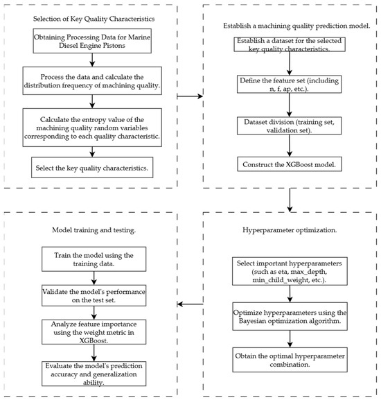 Flowchart of key quality characteristic identification and quality prediction method for marine diesel engine piston machining based on information entropy and XGBoost hyperparameter optimization.
