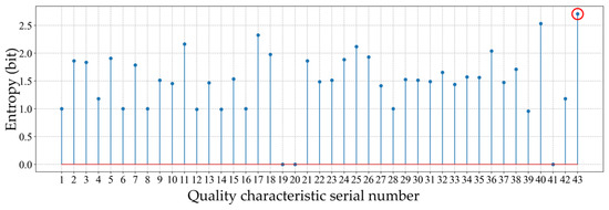 As seen in Figure 5, the entropy value corresponding to the 43rd quality feature in Table 3 is the largest (marked by a red circle). The machining quality of the No. 43 quality feature fluctuates significantly, indicating poor machining consistency. Therefore, we select this quality feature as the critical quality feature.