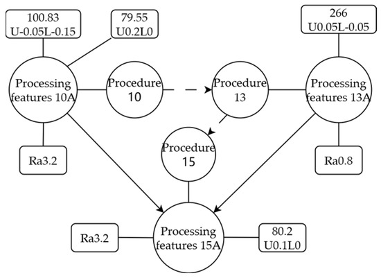 As shown in Figure 5, both the preceding machining feature 10A and the machining feature 13A influence the machining feature 15A. The machining feature 10A serves as the positioning reference for the machining feature 15A, while the roughing process of the machining feature 15A affects the machining feature 13A. Consequently, the machining error and the roughing error of the positioning reference are the other two characteristics of each piece of data. The data are labeled with the machining quality of the critical quality feature, i.e., the actual machining dimension measurement.