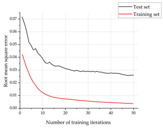 The XGBoost model is trained iteratively 50 times. As the number of iterations increases, the change in root mean square error (RMSE) of the model on the training set and test set is shown in Figure 8. It can be seen from the figure that, with an increasing number of training iterations, the RMSE of the model on both the training set and the test set shows a decreasing trend. In the first 30 iterations, the RMSE of the model on both sets decreases rapidly. With the same number of iterations, the RMSE of the model on the training set is smaller than that on the test set.