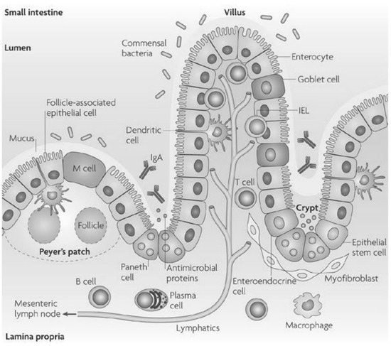 The gut epithelium is made of numerous cell types (enterocytes/colonocytes, goblet cells, stem cells, enteroendocrine cells, Tuft cells, M cells, and Paneth cells) (Figure 1) [10]. While enterocytes are present everywhere, goblet cells are on the villi, and Paneth cells can be found in the crypts [11].