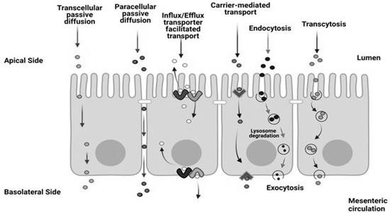 As digestive enzymes hydrolyze foodstuffs in the intestinal lumen, bioaccessible molecules are released and are transferred into the bloodstream by passive or active transport through the intestinal epithelium [19]. Passive transport is manifested in transcellular or paracellular diffusion, while active transport can be realized by influx/efflux transporter-facilitated transport, carrier-mediated transport, endocytosis, and transcytosis (Figure 2) [12]. All cell types are capable of these absorption processes but enterocytes express a selection of genes that maximize the absorption of food components [20].