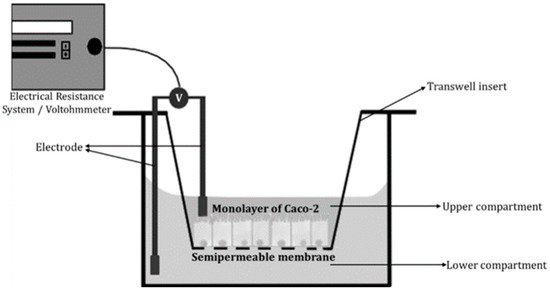 It is essential to determine barrier integrity before and after the experiment, to be sure that the absorption measurements are accurate. Thomas et al. [58] describe transepithelial electrical resistance measurements (TEER), dextran permeability, and cellular junctional complex imaging as proper methods to measure barrier integrity. Out of these, TEER is the most commonly used. TEER measures “the resistance of electrical current passing through a cellular monolayer”, thus representing the permeability of ions and barrier integrity (Figure 4) [58]. Phase contrast and fluorescence confocal microscopy can also be applied to evaluate the morphology of the cells [59].