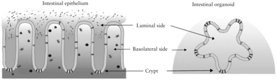 In the case of organoids, the apical part of the epithelium faces the inside of the organoids. This hinders the investigation of the effect of bacteria and food components on organoids and the evaluation of transport processes [42,62]. In contrast with the in vivo organization, in this case, the regions that are similar to the villus do not form protrusions, while crypts extend outwards (Figure 5). In the case of normal gastrointestinal organization, the apical part of the epithelium is oriented in the direction of the lumen, where it comes into contact with the digesta and microbiota.