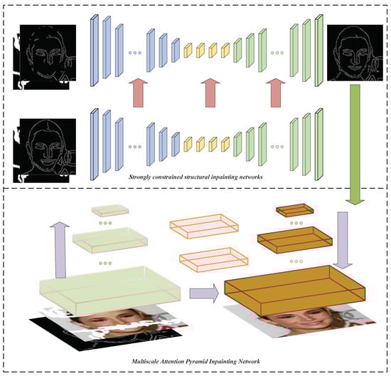 The methodology proposed in this document is illustrated in Figure 1. Overall, the structure-guided multi-scale attention pyramid Network for image inpainting can be divided into two main parts. The first part consists of a structure repair network with strong constraints, employing a U-Net-based encoder–decoder network as its backbone, a structure that has been extensively validated for its effectiveness. Additionally, this part includes an adversarial network with the same architecture, which uses real structures for feature extraction to constrain the structure prediction network. After the edge structure repair network generates the structural view, the second part, the cross-scale attention pyramid repair network, commences operation. The core strength of this network lies in its ability to fully utilize multi-scale information of the image and enhance the extraction and repair of key features through the attention mechanism. Initially, the cross-scale attention pyramid repair network performs multi-scale feature extraction on the input structural view. Through a pyramidal hierarchical structure, the network captures feature information from global to local scales, facilitating a comprehensive understanding of the image’s structure and details.