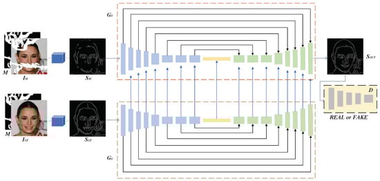 The structure prediction of missing image regions directly influences the quality of the final image inpainting results. The detailed architecture of the proposed dual U-Net constrained structure network is depicted in Figure 2. This network serves as the first component of the entire repair system, aiming to generate edge images that closely resemble the real image structure, thereby enhancing the accuracy of the image inpainting outcomes. The network features two identical branches of generative adversarial networks (GANs), each consisting of a U-Net-based generator [] and a PatchGAN-based discriminator []. The U-Net extracts features from the input image through its encoder, capturing structural and textural information across multiple scales. This multi-scale feature extraction capability enables U-Net to fully understand the context of the image, providing robust support for the subsequent repair process. In the decoder segment, U-Net gradually restores image detail by upsampling and merging with high-resolution features from the encoder, allowing the repaired image areas to seamlessly integrate with surrounding regions, maintaining the overall integrity and consistency of the image. Additionally, the skip-connection mechanism introduced by U-Net allows for direct transmission of low-level and high-level feature information, thus avoiding information loss and aiding in the recovery of more detailed image features.