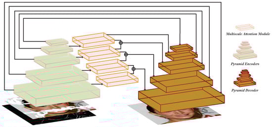 To capture more precise features, once the pyramid context encoder learns latent features, it transmits them from higher to lower semantic features through the multi-scale attention fusion module. Given a pyramid context encoder composed of L layers, the feature maps from deeper to shallower layers are represented as , with each layer’s features constructed by the multi-scale attention fusion operation: