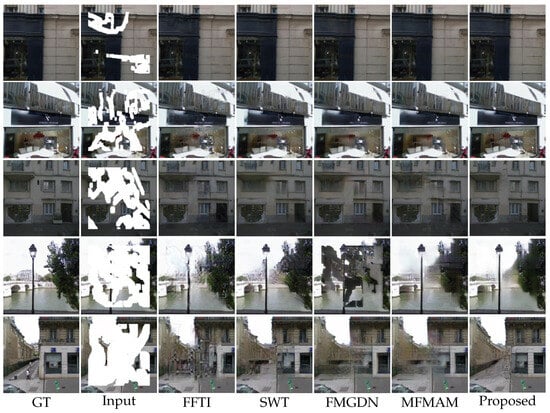 Inpainting results of different image inpainting methods on the Paris Street View dataset. The first column presents the real image, the second column shows the damaged image, and the subsequent columns display the inpainting results of FFTI, SWT, FMGDN, MFMAM, and the proposed method, respectively.