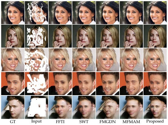 Inpainting results of different image inpainting methods on the CelebA dataset. The first column presents the real image, the second column shows the damaged image, and the subsequent columns display the inpainting results of FFTI, SWT, FMGDN, MFMAM, and the proposed method, respectively.