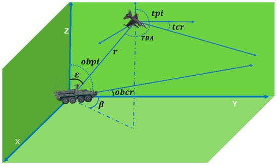 Observer–target movement in an aerial environment. : Bearing. : Target course, : Observer course, r: Range. TBA: Target Bearing Angle, tpi: Target Pitch, obpi: Observer pitch, : Elevation.