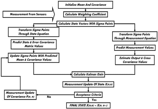 To anticipate the system’s future states, the sigma points are transmitted through the nonlinear state equation (f). The predicted state mean (x’) and error covariance matrix (P’) are computed using the converted sigma points as a base. This step estimates the system’s status at the following time step. The predicted sigma points are translated using the measurement equation (h) to produce expected measurements. The anticipated measurement (z’) is computed using the altered sigma points as a base. The predicted mean and covariance values are used to update the sigma points. The cross-covariance matrix (Pxy) and output estimate (y) are computed. The output covariance (Pyy) and the expected error covariance (P’) are used to calculate the Kalman gain (K). The Kalman gain determines the impact of the measurement update on state estimation. The difference between the expected measurement (z’) and the actual measurement (z) is used to update the state estimate (x) along with the Kalman gain. The output covariance (Pxy) and the Kalman gain are used to update the error covariance matrix (P). Acceptance criteria are compared with the modified state and covariance values. The procedure ends if they satisfy the requirements. If not, step 2 of the algorithm is repeated.