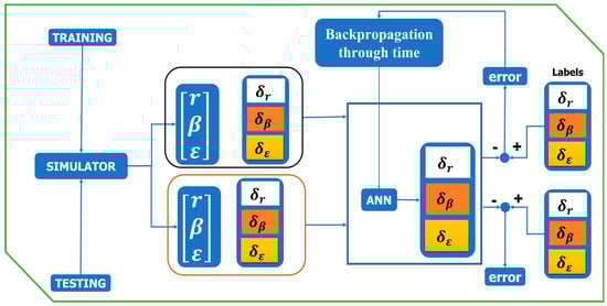 Figure 3 provides descriptive insight into steps undertaken to train and test the DL models, where the proposed system, a simulator, was developed to produce a dataset for training and testing. Range (), bearing (), and elevation () measurements were used as input to the neural network, which forecasted the standard deviations of those measurements. At each epoch, the predicted output of the neural network was compared to the actual output using a mean squared error as a loss function. The error was calculated and backpropagated in the network to adjust weights. Over time, once the error was reduced to a minimum, models were exported to be integrated into UKF. In this study, 300 possible scenarios are carefully designed. Each of these scenarios is used to simulate the target-observer movement dataset according to Figure 3.