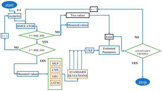 Moreover, from Equation (11), the initial covariance matrix . For evaluating the performance of the system, which incorporates DL models with UKF, five different scenarios were designed. Table 4 shows the values for those scenarios.