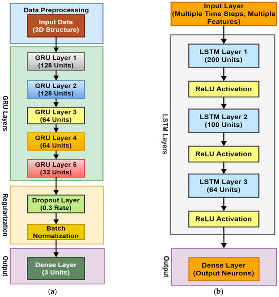 This paper presents a deep learning model for time series prediction using LSTM networks. The model has four layers, including three LSTM layers and one dense layer. The first LSTM layer has 200 units, the second has 100 units, and the third has 64. All three LSTM layers use the ReLU activation function. This model can also learn hierarchical representations of input data with multiple time steps and features (Figure 8a). The image depicts a recurrent neural network (RNN) architecture for processing 3D input data that employs Gated Recurrent Units (GRUs). The architecture is made up of five layers: input, GRU, dropout, batch normalization, and dense. The GRU layers handle sequential data well, extracting higher-level features while reducing overfitting and enhancing training stability. The final layer is a fully linked layer with three units representing output classes from a classification operation.