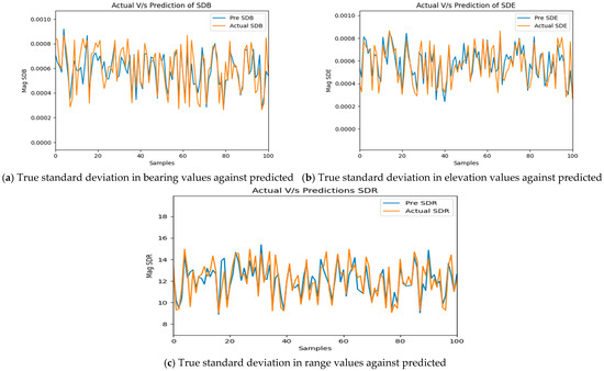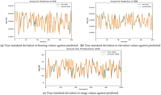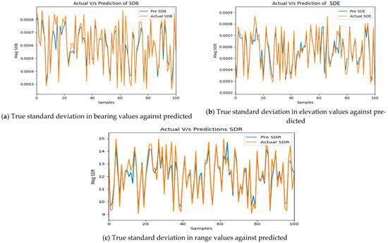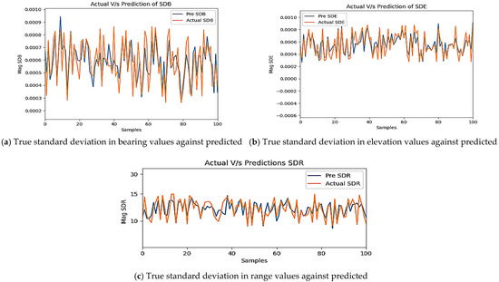 A comparative analysis of the actual and predicted values of standard deviations for specific parameters in a system is presented in Figure 9a–c. These parameters appear to be associated with bearing, elevation, and range values, potentially in the context of object tracking or localization. The model’s ability to predict bearing values’ variability (standard deviation) is contrasted with the actual variability observed in the data in Figure 9a. The model’s capacity for predicting the variability of elevation values is illustrated in Figure 9b. The model’s ability to predict the variability of range values is evaluated in Figure 9c.
