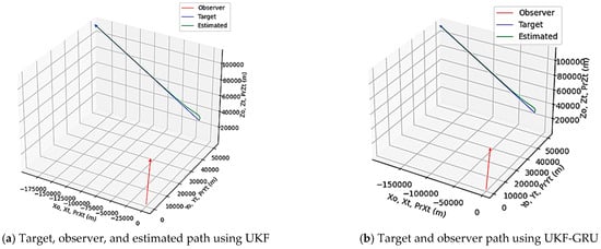 Figure 13a displays the true path of both the target and observer, as well as the estimated path of the target achieved through the utilization of the UKF algorithm. The standard deviations implemented in the UKF algorithm are determined based solely on human intuition and experience, with an assumption of being within the range of 0 to 3 degrees. The UKF algorithm alone has demonstrated efficaciousness in estimating the unknown states of the target as expected. Where xo, yo, and zo are the observers’ x, y, and z coordinates. xt, yt, and zt are the target’s x, y, and z coordinates. prxt, pryt, and przt are the estimated x, y, and z coordinates.