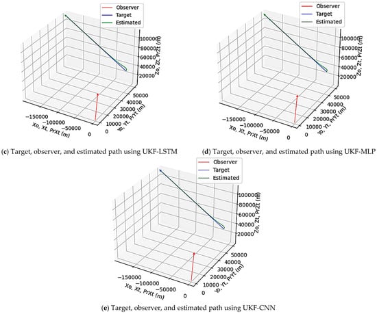 Observer, target’s true and estimated paths using (a) UKF only, (b) UKF-GRU, (c) UKF-LSTM, (d) UKF-MLP, and (e) UKF-MLP.