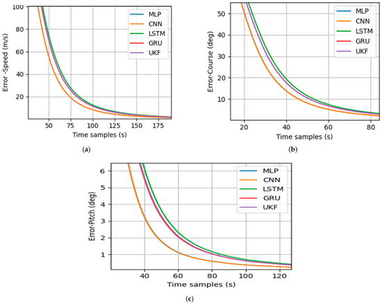 Figure 13b–e depict the true path of both the target and observer, as well as the estimated target path achieved through the integration of GRU, LSTM, MLP, and CNN, respectively, into UKF. For comparative purposes, the accompanying graphs depict a combination of the mean square error for range, bearing, elevation, course, and speed of all model predictions.