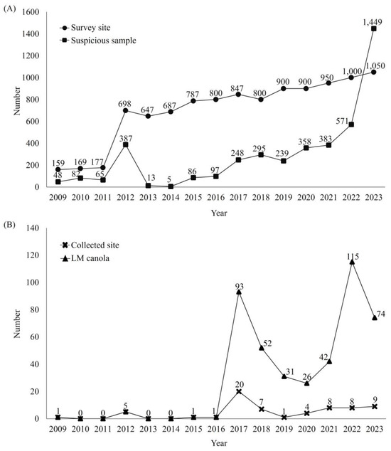 Survey results of LM canola monitoring from 2009 to 2023. (A) The number of LMO monitoring sites (circle) and collected suspicious samples (square) by year. (B) The number of LM canola collection sites (X-labeled) and collected LM canola samples (triangle) across nationwide LMO monitoring areas over fifteen years.