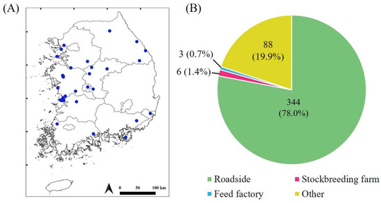 Classification of LM canola collection sites from 2009 to 2023. (A) Distribution of LM canola collection sites in South Korea for fifteen years. (B) Percentages of collection site types.