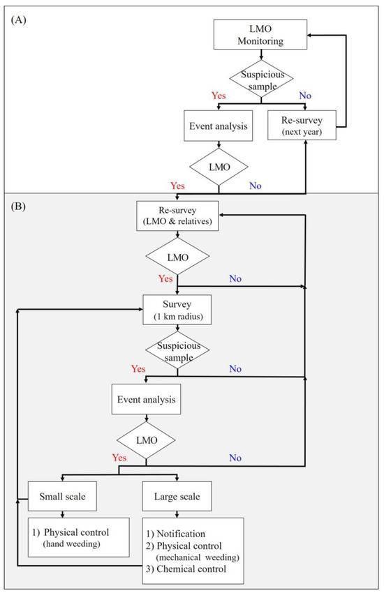Monitoring and management of LM canola. (A) General LM canola monitoring process. (B) The post-management process for the fulfillment of LMO safety policy and research in South Korea (4 times per year).