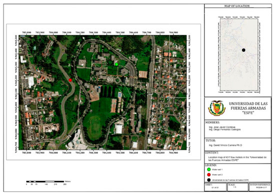 - Garcés Alarcón, R.A. Diagnóstico y Propuesta de Mejora de Agua Potable y Alcantarillado en la Universidad de las Fuerzas Armadas ESPE Matriz Implementando Caudalímetros Inteligentes IoT; Civil Engineering Tesis; Universidad de las Fuerzas Armada ESPE, Sangolquí, Ecuador: Sangolquí, Ecuador, 2022; Available online: https://repositorio.espe.edu.ec/handle/21000/28988 (accessed on 25 March 2024).