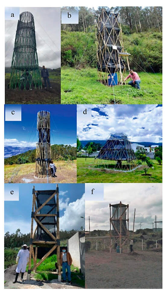 Structural model of fog catchers for communities: (a) Galte Laime, (b) Farm Urku Huayku, (c) Ilaló volcano, (d) Conocoto Quinta Girasoles, (e) Conocoto Parque Metropolitano del Sur, collapsible tower, and (f) Bunche, collapsible tower.